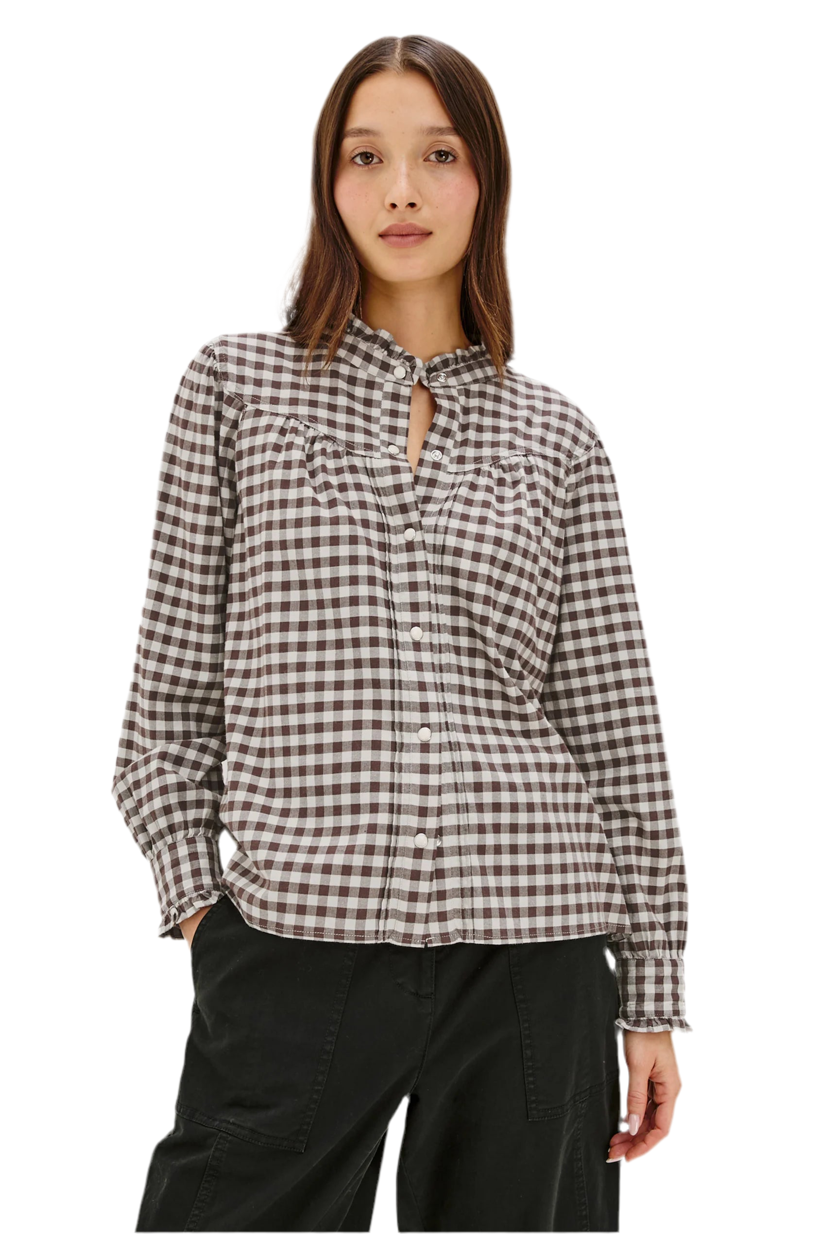 The Alanna is a light brushed cotton-blend blouse that balances comfort with refined details. A curved yoke, ruffled collar, and marble snap buttons nod to Western inspiration.