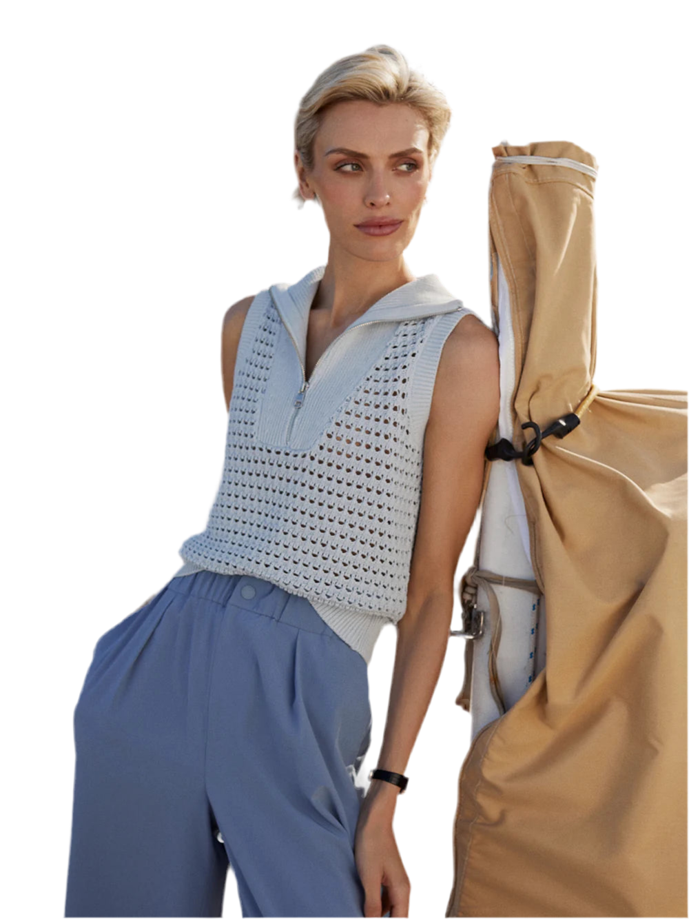 Made from our 100% cotton Float Pointelle Knit, this half-zip tank top will add a luxurious tactility to your look. The slightly cropped hem will work well with high-waisted pants and shorts.