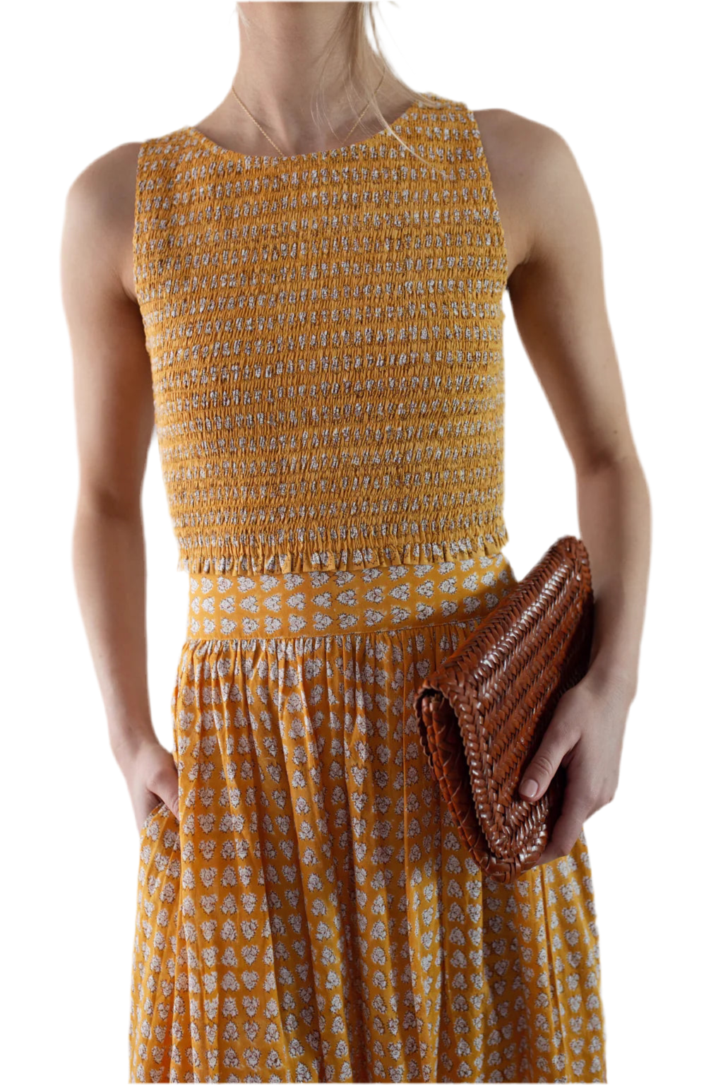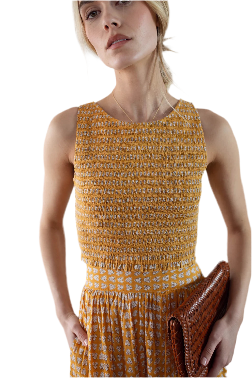 Introducing our new Charlotte Top, a beautifully smocked and fitted silhouette designed to flatter effortlessly. This timeless piece features a classic boatneck shape and a delicate keyhole button back for a refined touch. Hitting perfectly at the natural waist, it pairs seamlessly with high-waisted skirts, like it's coordinating Charlotte skirt or denim for an elegant yet easy look. The Charlotte Top is a versatile staple that transitions effortlessly from day to night, making it a must-have addition to your wardrobe.