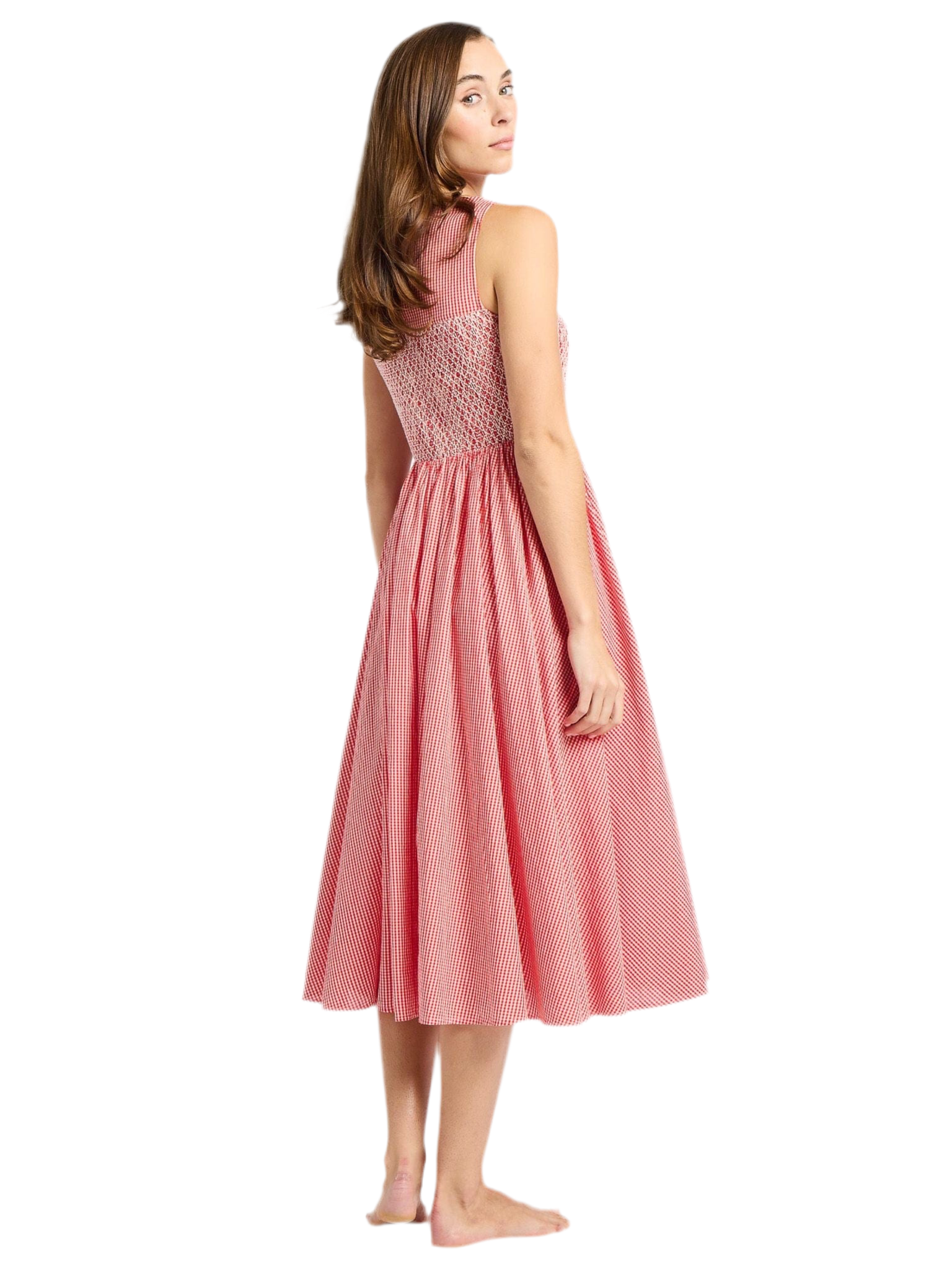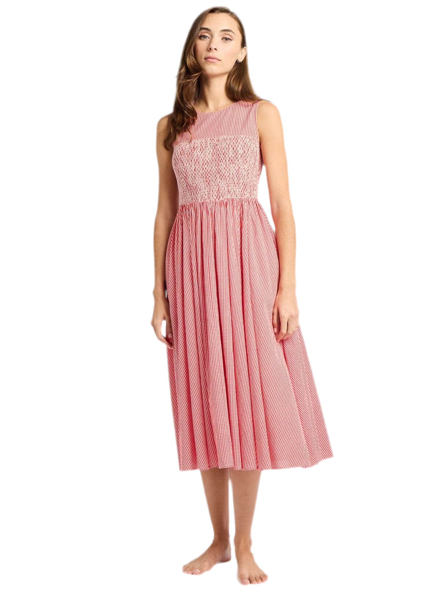 Our sleeveless Coco dress has a rounded neckline with a single button keyhole closure at the back. Elastic hand smocking from the bustline to the natural waist with a mid-calf length skirt. Dress unlined with pockets.