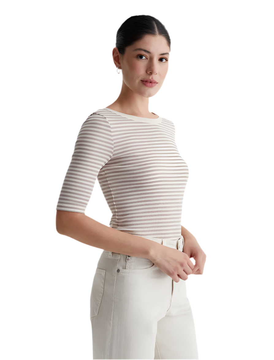 The Diana Top evokes classic ballet styling with its slim fit, half sleeves, and scoop back. This version comes in a soft, breathable rib knit that's patterned with white and beige stripes and contrasted by white trim along the neckline.