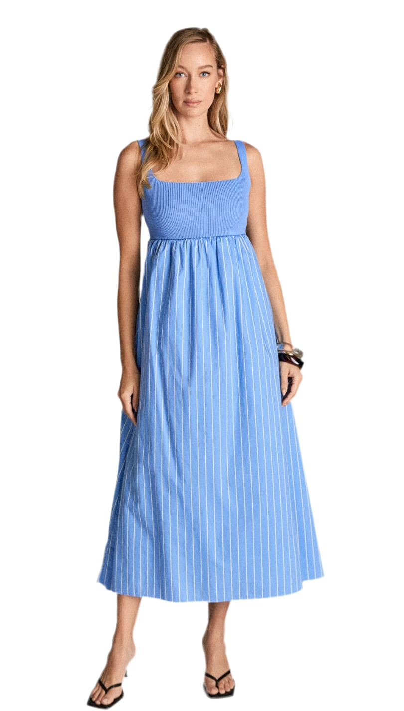 Charming, comfortable, and designed to move with you. The Eliza Knit Midi Dress is a warm-weather essential with a playful twist. Featuring a ribbed knit bodice and contrast striped skirt, this style is complete with adjustable back tie straps, wide shoulder straps, and an elastic back panel for a flexible, flattering fit. Hidden side pockets add a dose of practicality, while the full lining ensures all-day comfort. Finished in a breezy maxi length, Eliza blends softness and structure for the ultimate easygoing elegance.