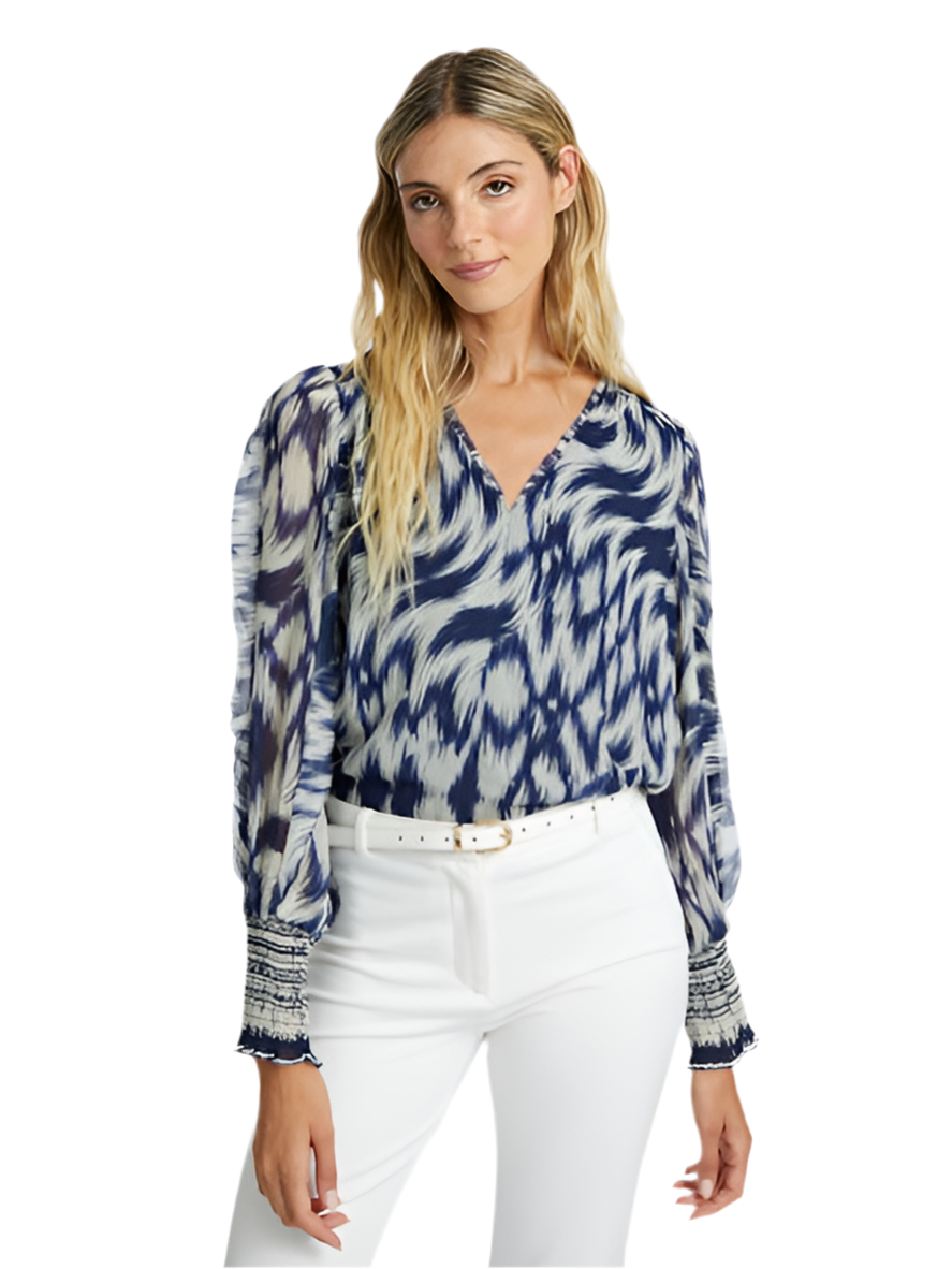 Our gorgeous Flora Top in the Blue Katsuri print. This long-sleeved blouse offers romantic elegance with soft, billowy sleeves, smocked cuffs, and a deep V-neckline.