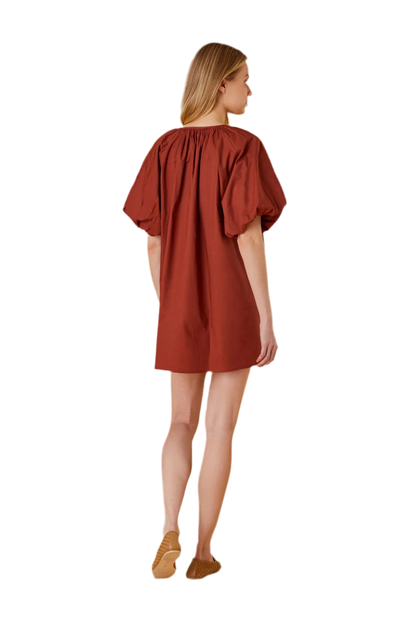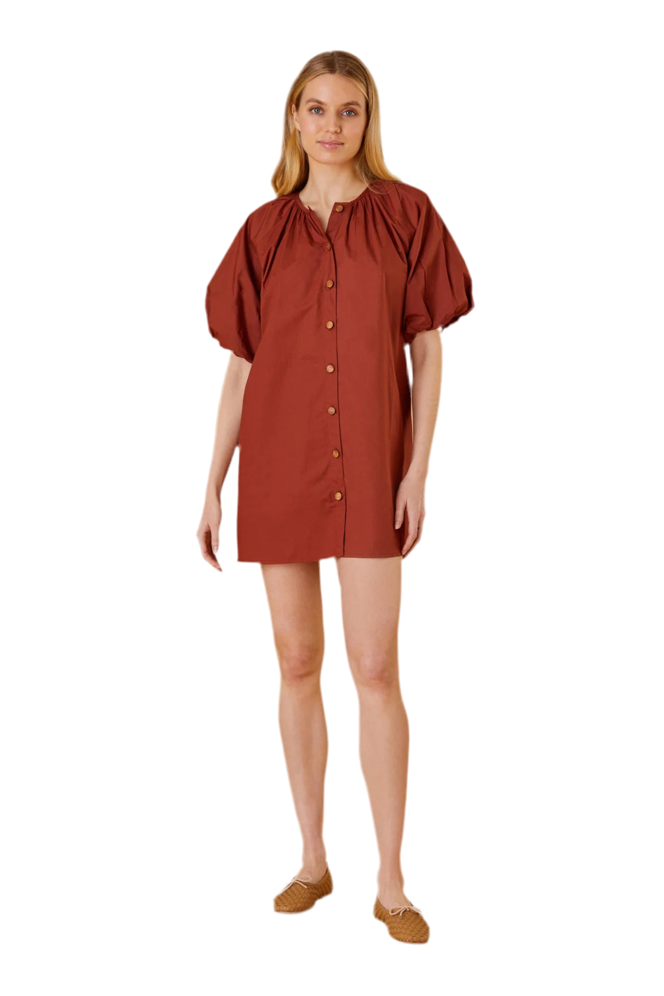 An adorable mini that will transition seamlessly from summer to fall. This style features delicate button details and playful puff sleeves with an overall relaxed fit. Pair with chic slides or knee-high boots for an easy, effortless outfit.