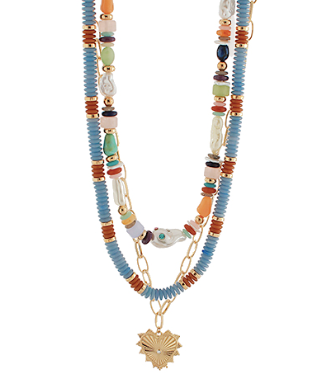 Heart Pendant Multi Bead Triple Necklace- Blue