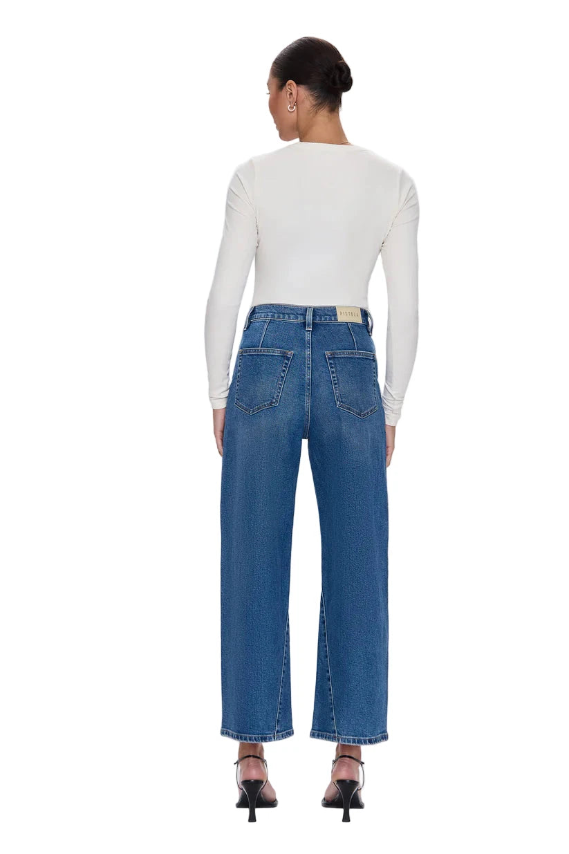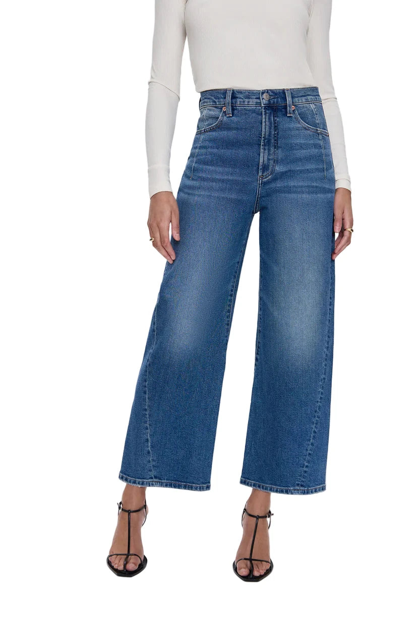 The new must-have jean with a twist. Kyra sits confidently at a high rise with our signature bowed leg silhouette and cropped 28" inseam. The subtle curve creates dimension while the wide ankle opening adds modern proportion with a new wide angle for the season. Fashion detail seaming, including a twisted seam that moves forward and yoke seams in the back, brings modern denim classic sophistication. Crafted from our signature comfort stretch denim in Soho, a medium vintage wash with subtle fading that feels both contemporary and timeless