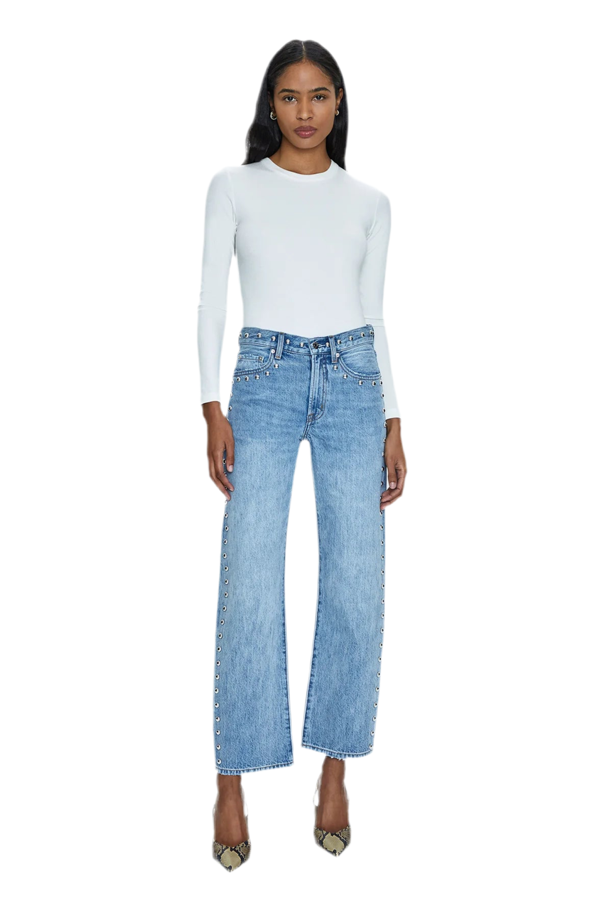 Mid-rise, with a straight leg that bows at the knees for an arched silhouette. Ankle length crop with a clean finish hem, crafted from rigid non-stretch denim for an expert fit that holds its shape. Satellite is a light blue denim wash with vintage fading, defined by linear stud decorations along both legs, waistband, and front pockets.