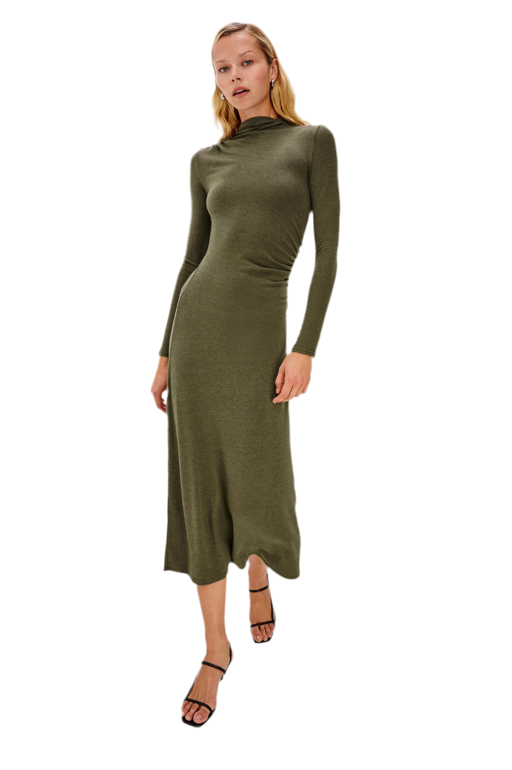The Margaret Dress offers refined comfort with a ultra-soft brushed tissue jersey fabrication, with a mock neck and diagonal shirring for a sophisticated silhouette.