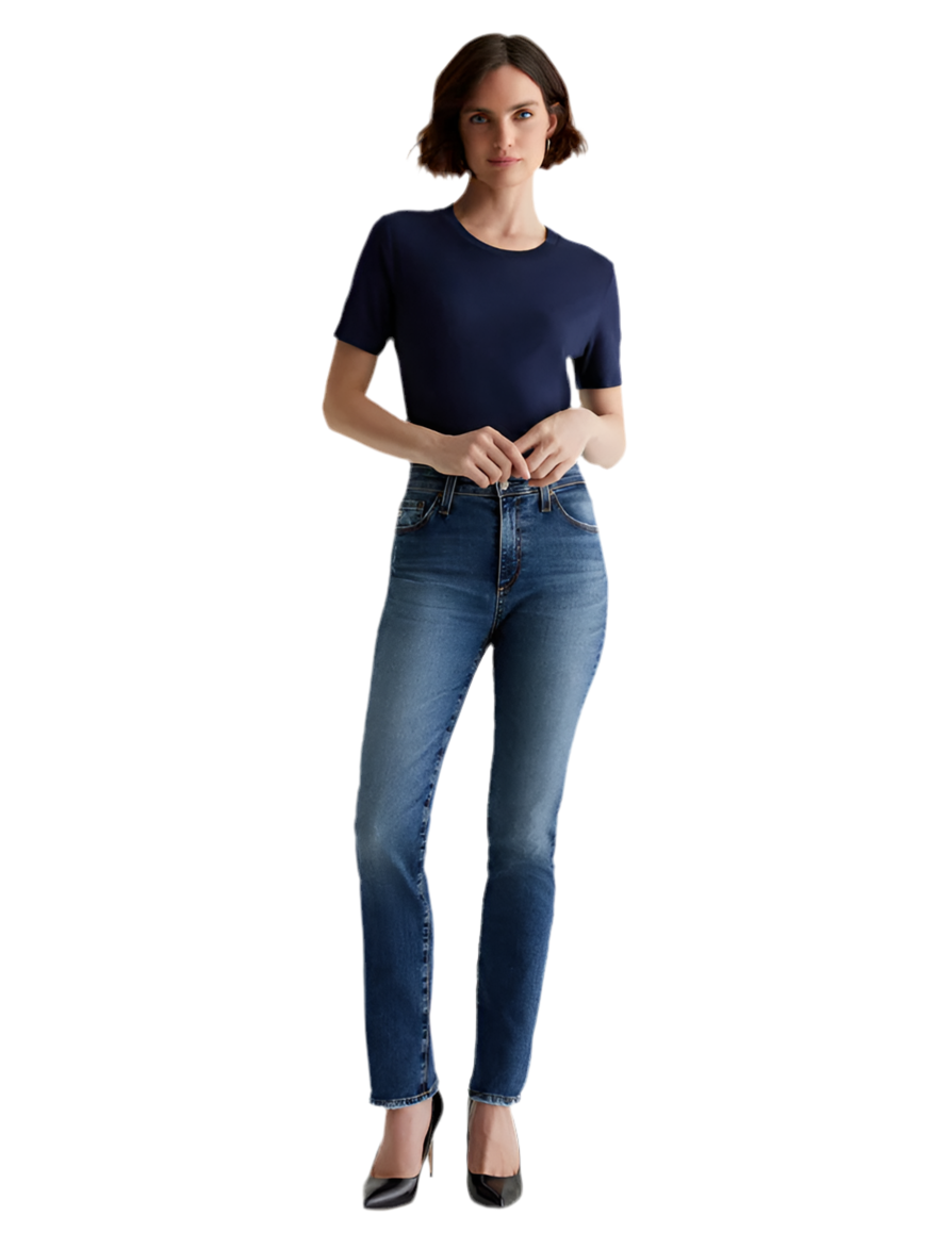 Mari is a mid-rise slim-straight jean featuring an AG-ed™ medium indigo wash that's faded to emulate 14 years of vintage wear. Worn pocket edges, nicks of distressing, and fraying hems add authentic lived-in character. Mari offers a flattering mid-rise waist and fits easy around the hips, finished with a straight leg and subtle slim leg opening. This women’s slim-straight jeans have shape-sculpting stretch in 10 oz. Empower Denim from Italy.