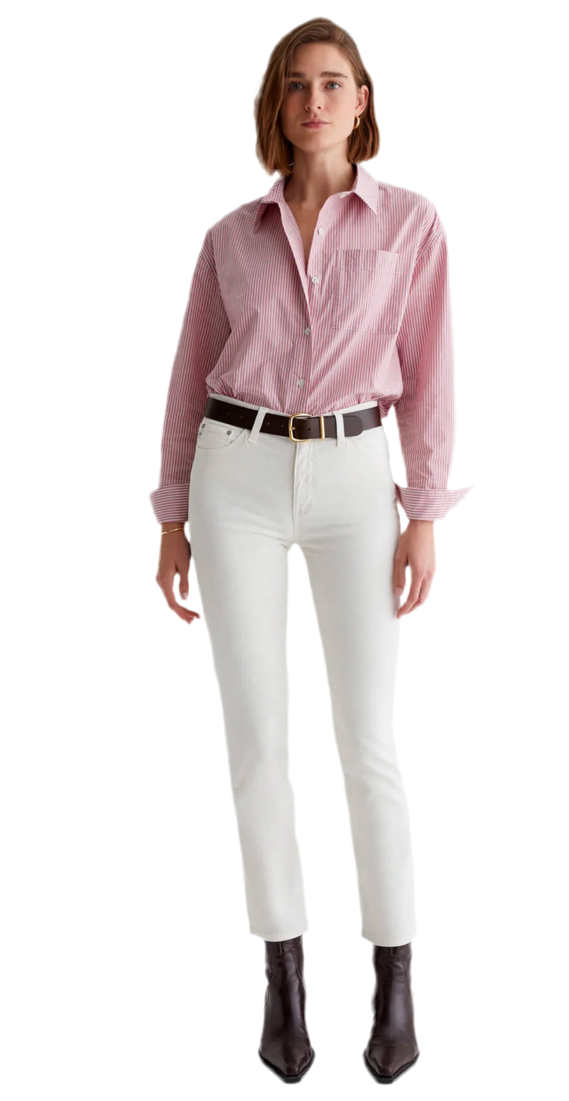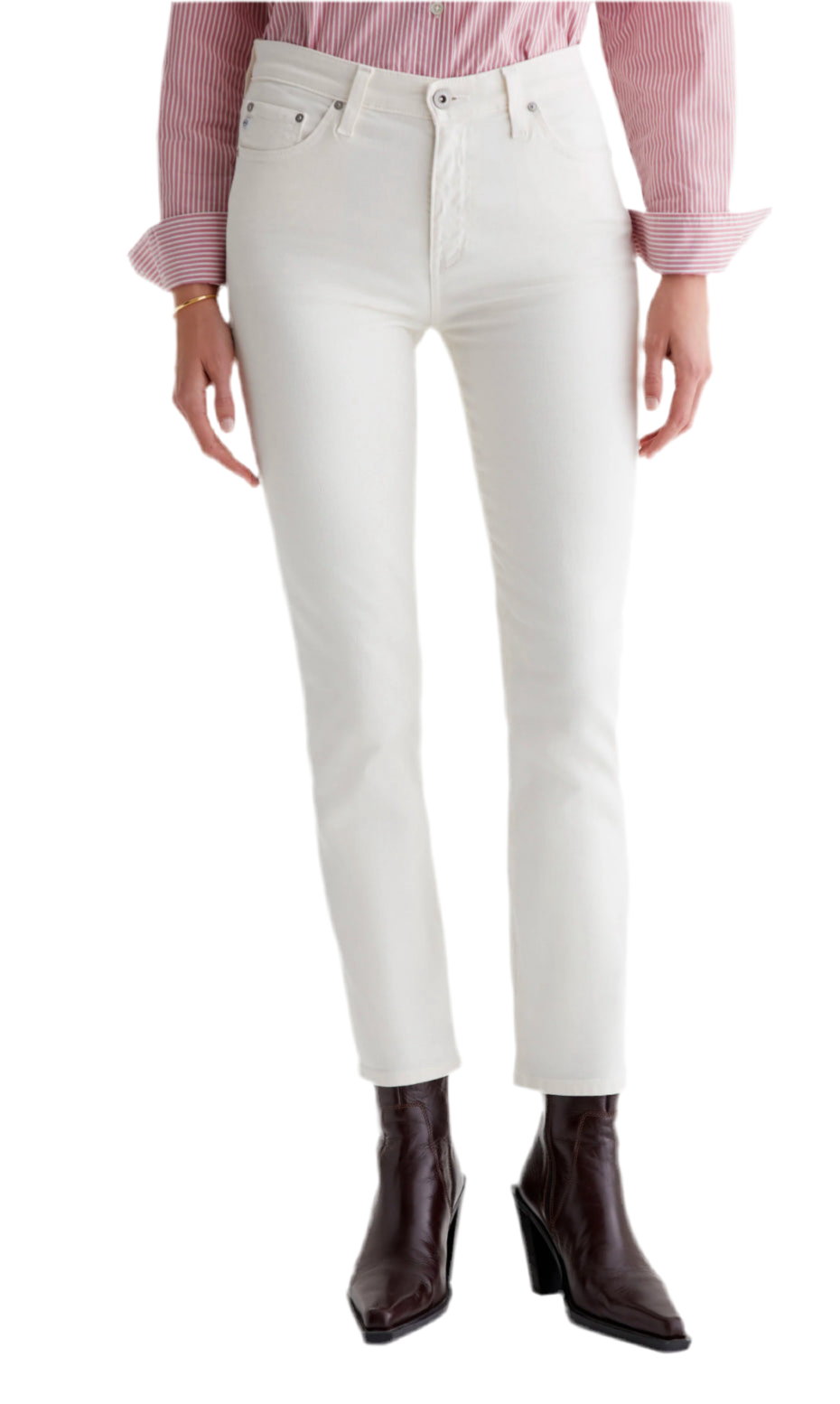 Mari is our popular mid-rise slim-straight jean for women, updated in powder-white denim with the softest feel. The five-pocket style has a natural waist and fits easy around the hips, complete with a straight silhouette that slims down at the leg openings. This pair is crafted from 8.7 oz. Hyper Soft Bull Denim, an exclusive AG Cloud Soft Denim™ fabric. The special left-hand twill construction allows the yarns to gently relax and untwist for a luxe, supple texture. It's designed to get even softer the more you wear it. There's dual-elastic stretch built in for extra comfort and powerful recovery.