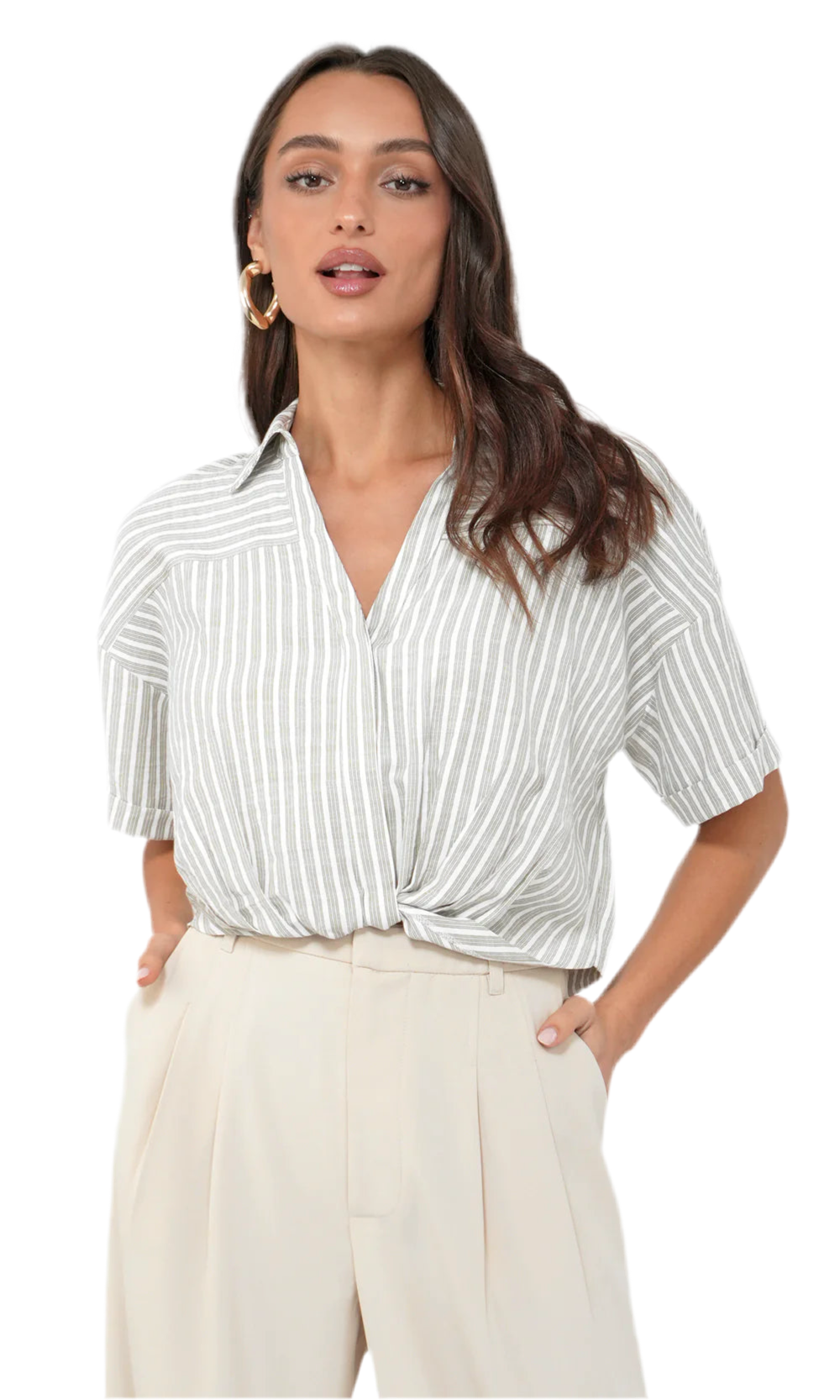 The Maria Shirt features a subtle vertical stripe, soft collar, and wide short sleeves with a rolled cuff. The front twist adds shape without effort, while the breezy fabric keeps the look crisp. Tuck it into tailored trousers or leave it loose with denim—this one handles both.