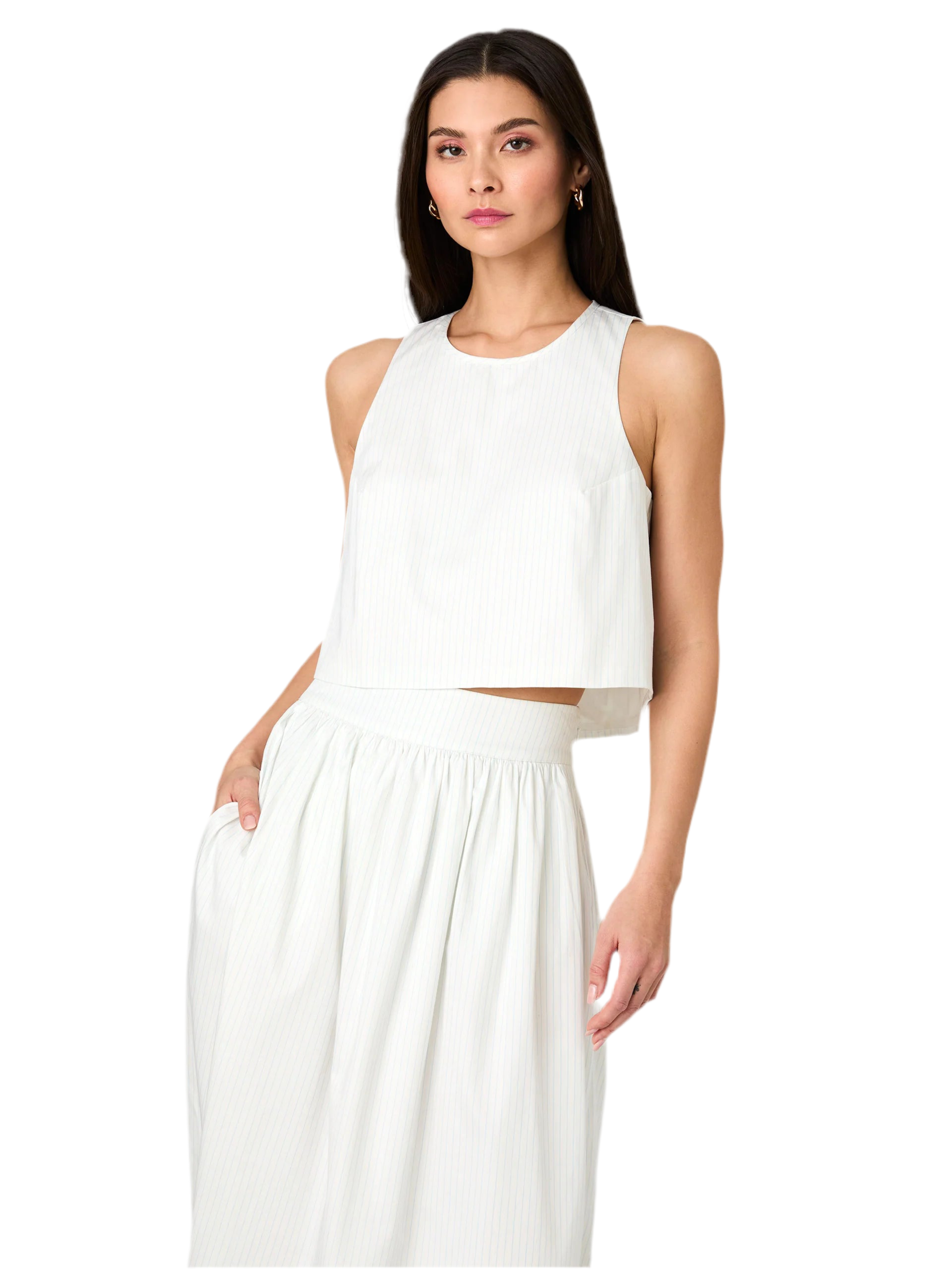 The Pinstripe Poplin Shell Top is the ultimate easy, structured crop top. Made from crisp cream-and-blue pinstripe poplin, it offers a clean, tailored look that’s perfect for any casual yet polished outfit. Pair it with the Pinstripe Poplin Midi Skirt for a coordinated, effortlessly chic ensemble.