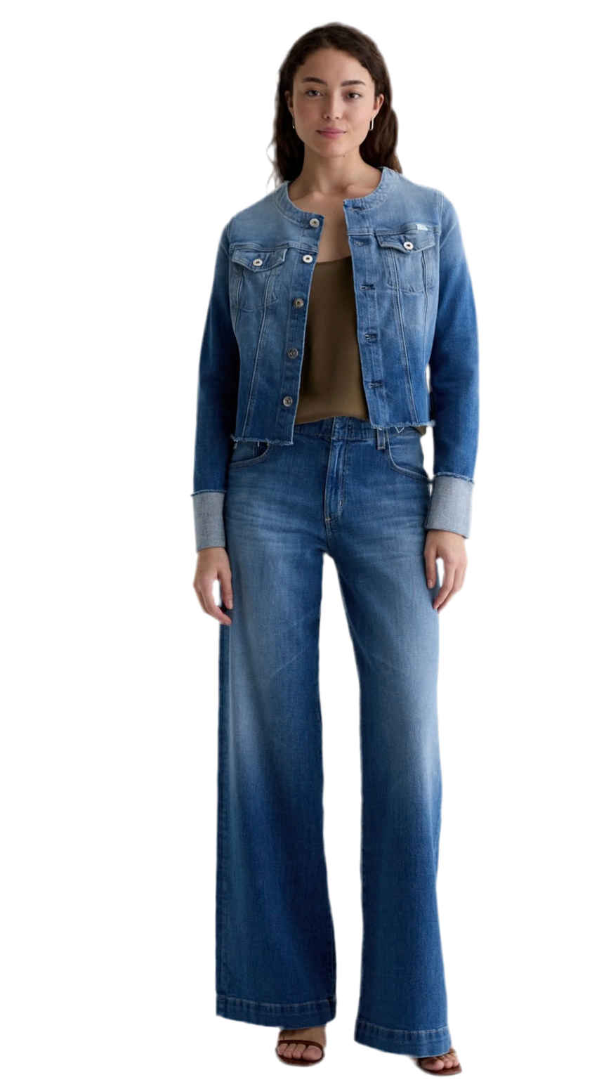 This fresh take on our famous Robyn jacket features a collarless neck line with a raw edge detail. Crafted from 11 oz. Journey Denim in a medium wash. Featuring a comfort stretch feel, it’s finished with raw hems, cuffed detailing, and two front button-flap pockets to make an elevated statement.