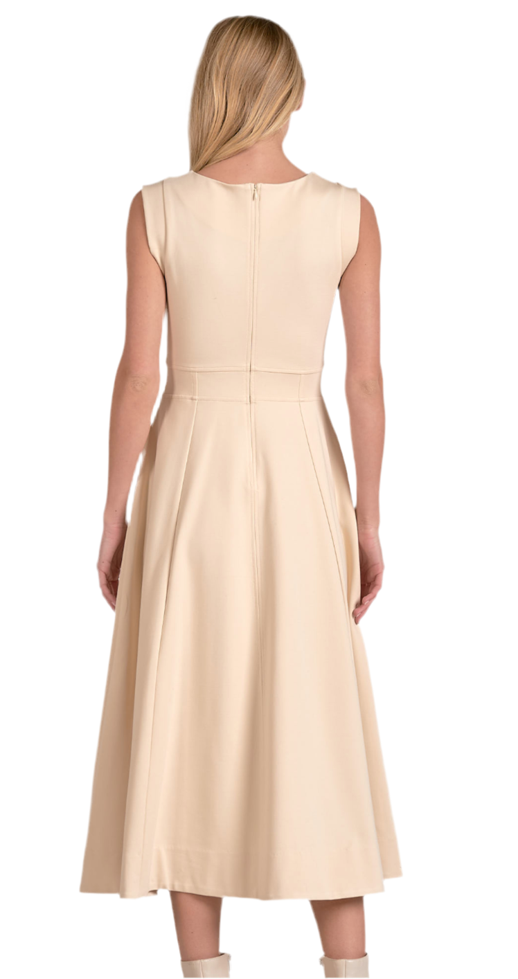 This elegant sleeveless midi dress in a neutral stone hue features a flattering seamed design that cinches at the waist, creating a feminine silhouette. The back zipper closure adds a touch of sophistication, making it suitable for both casual outings and more formal occasions. Its versatile style allows for easy pairing with various accessories and outerwear.