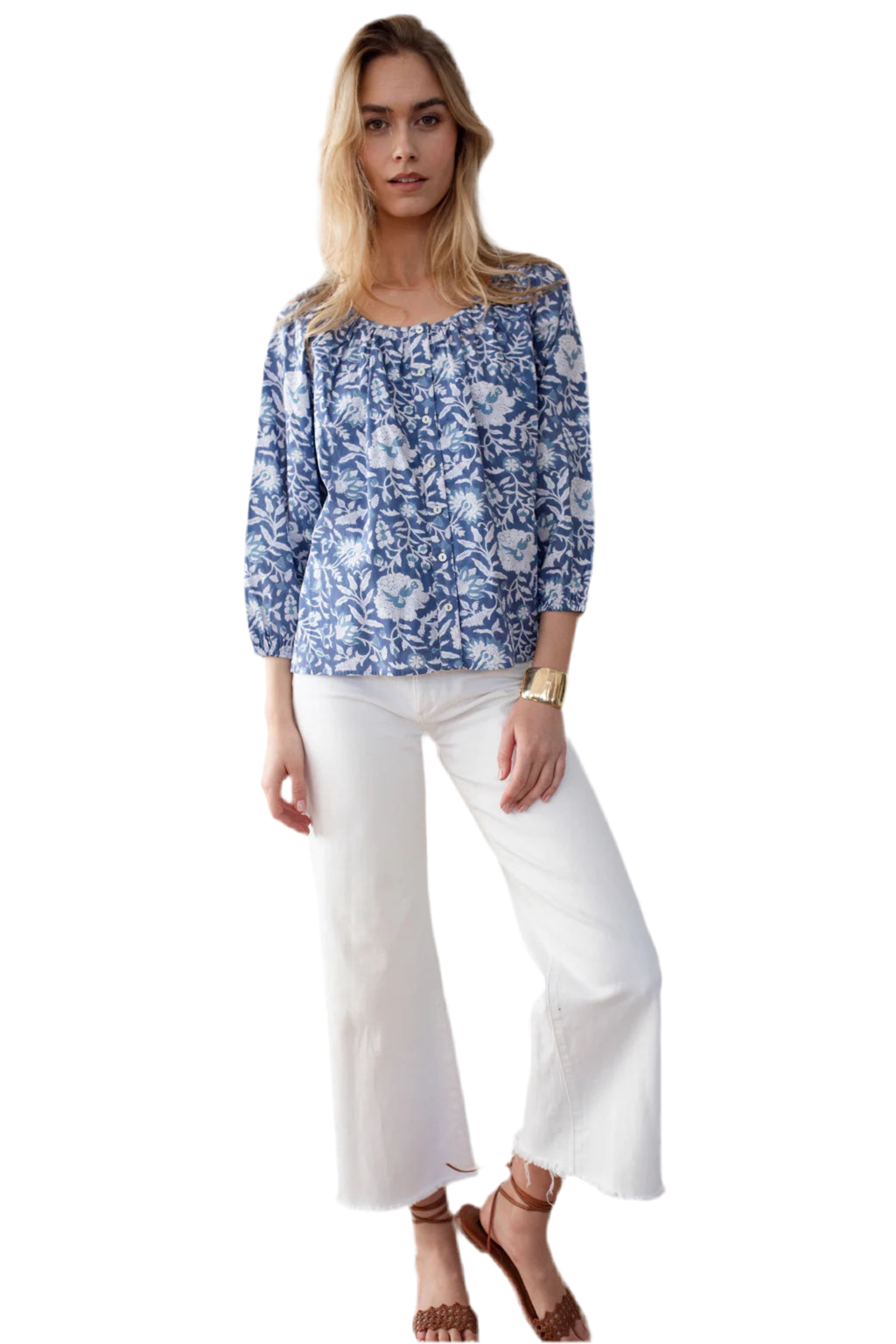 Introducing the Sophie Top, in our Indigo Blossom print, a best-selling piece designed with timeless elegance and effortless versatility. This three-quarter sleeve silhouette hits at the natural waist, offering a flattering, slightly boxy yet straight shape that complements all body types. The elasticized cuffs allow for easy sleeve adjustment, letting you customize the length and positioning for maximum comfort and style.