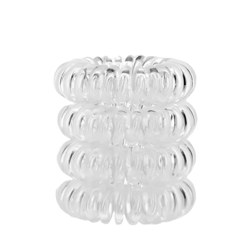 Telephone cord-style hair ties! Creaseless and dent-free hair coils by KITSCH come in chic clear/transparent styles. Headache & kink-free and perfect for every hair type! Pack includes 4 hair coils.