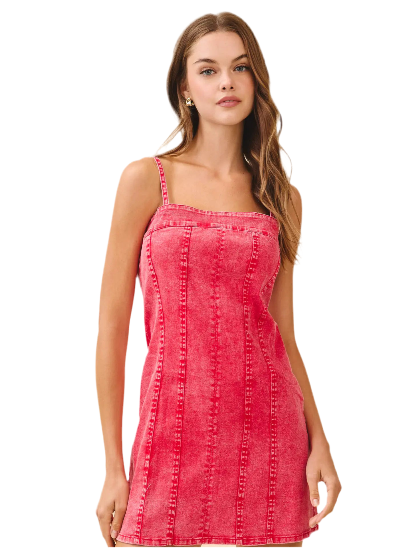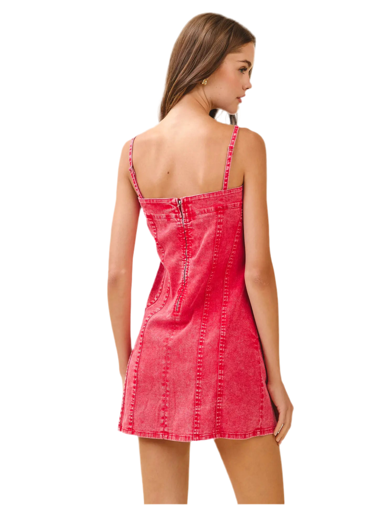 A structured denim mini dress featuring contrast topstitch detailing, a body-hugging silhouette, and spaghetti straps. The acid-washed finish adds a vintage edge, while the exposed back zipper gives it a modern touch.