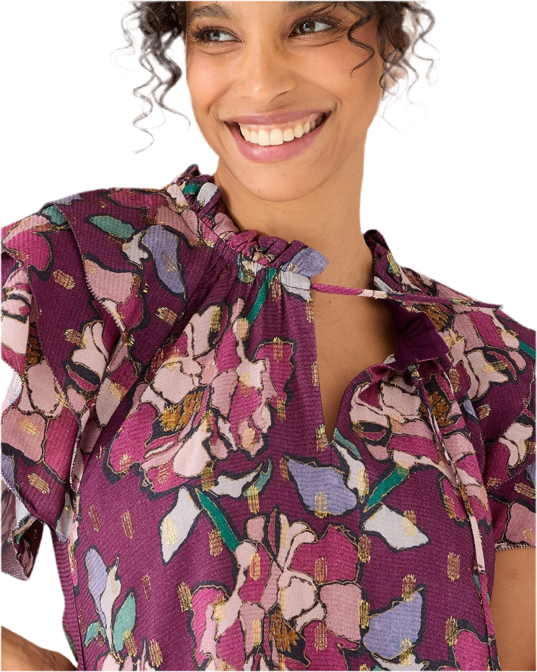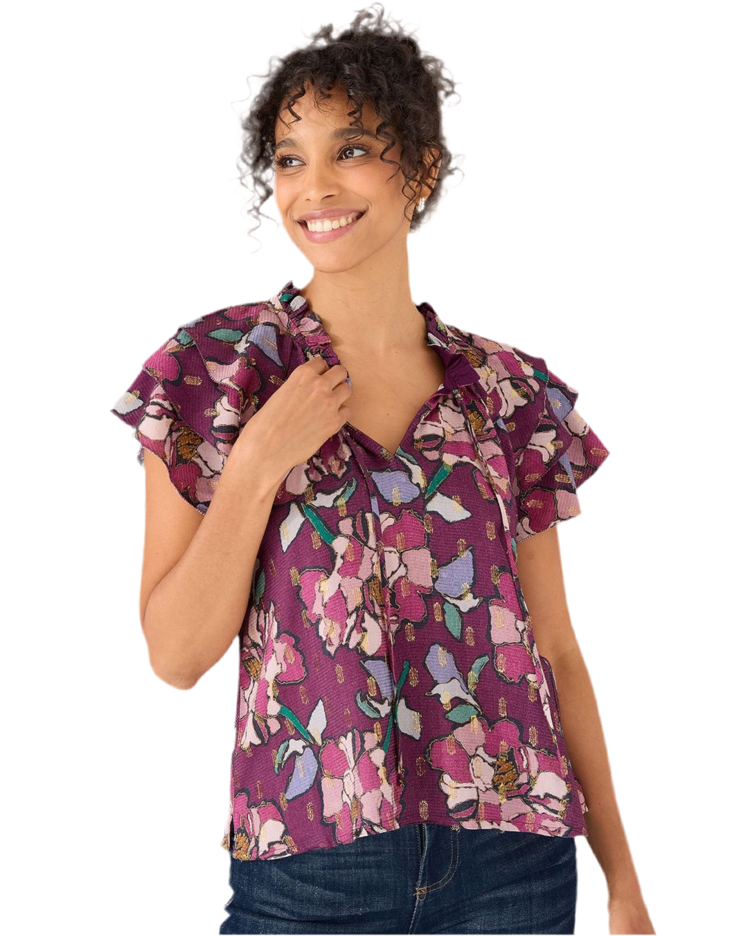 Flutter sleeve v-neck top that pairs great with denim or tucked into our Ara Skirt. Ruffle trim neck trim detail and optional adjustable neck tie.