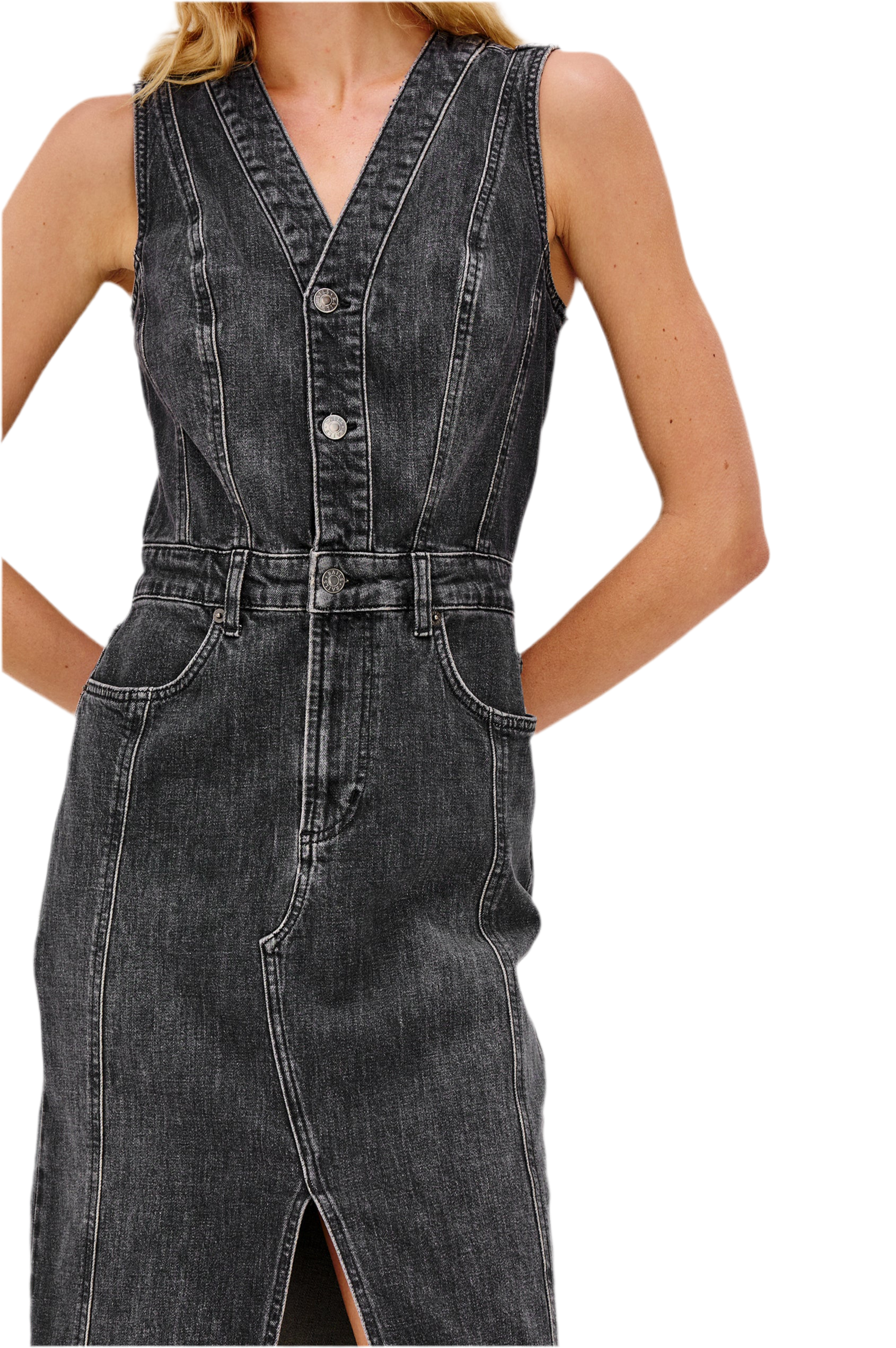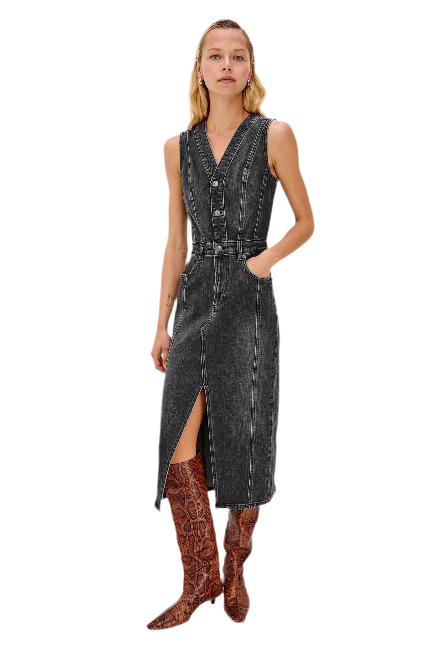 Skirt meets classic pinafore in the retro-inspired Westwood, a form-fitting denim dress finished with a hybrid zip, button-front closure and front slit for ease.