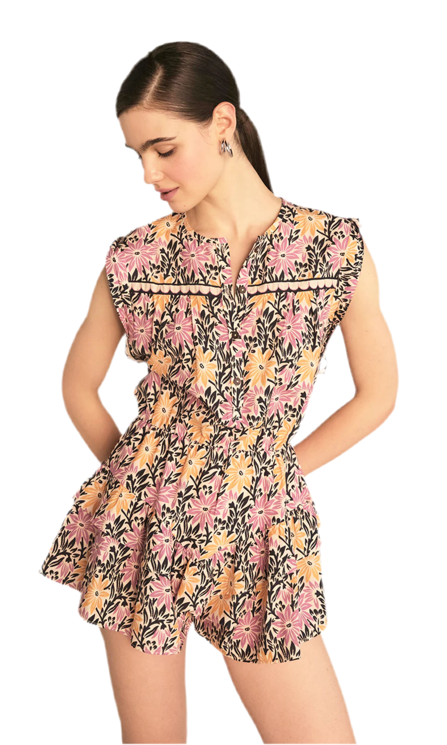 Floral wonder, our Xena romper is the perfect one and done look. The playful playsuit is made from a floral batik cotton fabric. She's soft and breathable, with a button front. Pair Xena with knee high boots for a fall ready look.