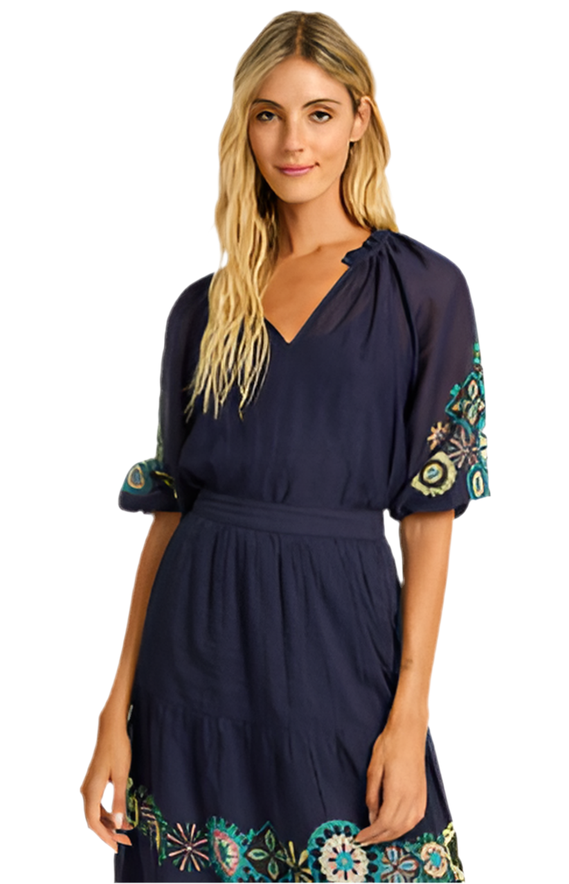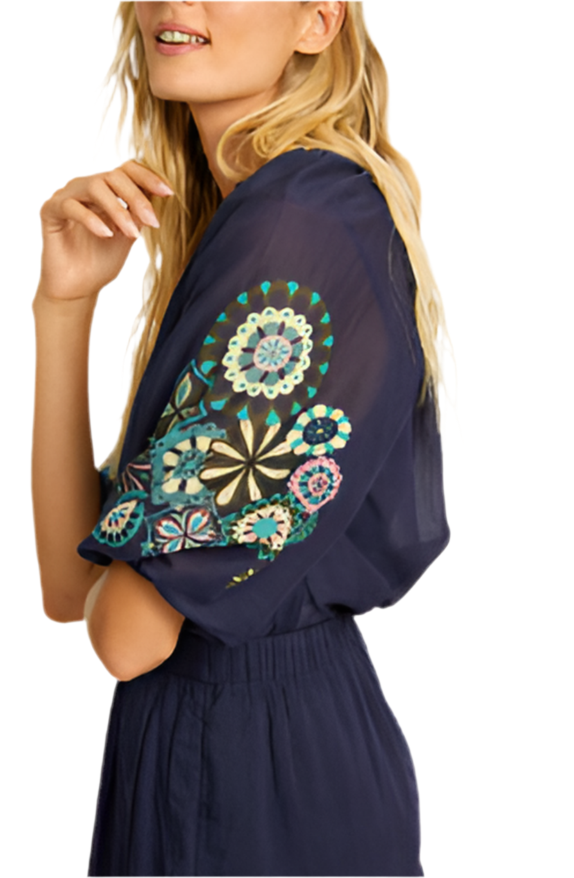 The floral print on the sleeves adds a playful yet elegant touch to this design. Designed with a v-neck and a ruffled collar in mind, it adds a feminine playful touch to the silhouette. With its lightweight feel and effortless style, the Zara Top pairs beautifully with jeans or skirts for a fresh, seasonal look.